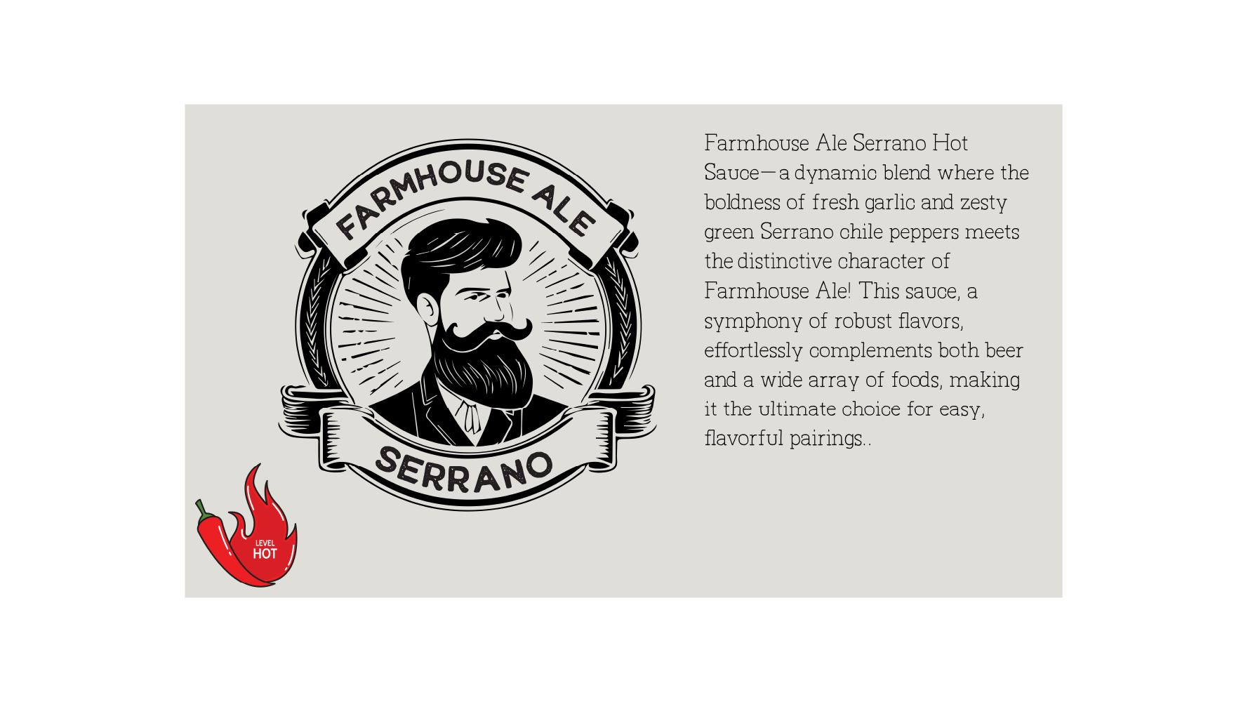 Farmhouse Ale Serrano Hot Sauce—a dynamic blend where the boldness of fresh garlic and zesty green Serrano chili peppers meets the distinctive character of Farmhouse Ale! This sauce, a symphony of robust flavors, effortlessly complements both beer and a wide array of foods, making it the ultimate choice for easy, flavorful pairings..